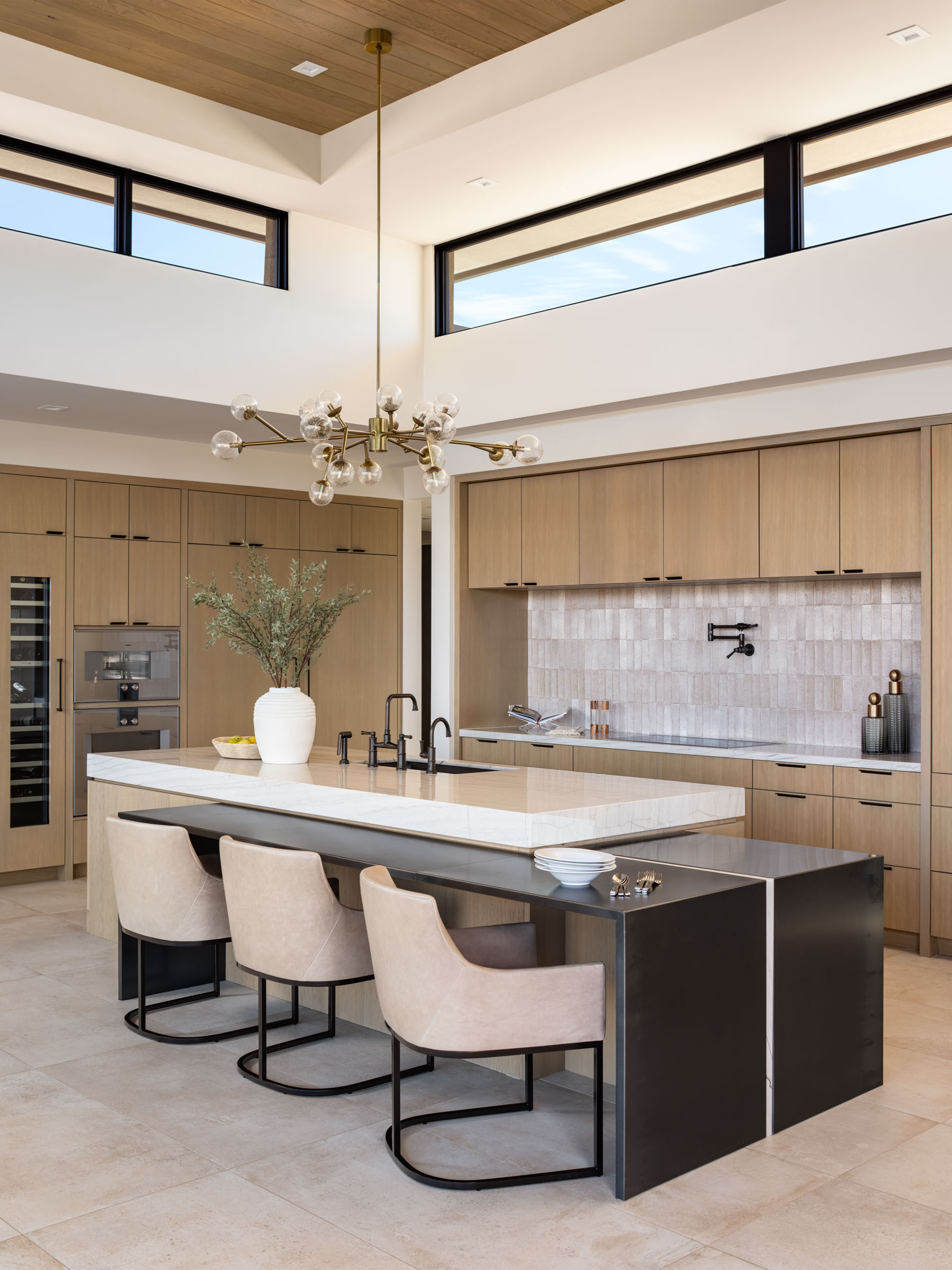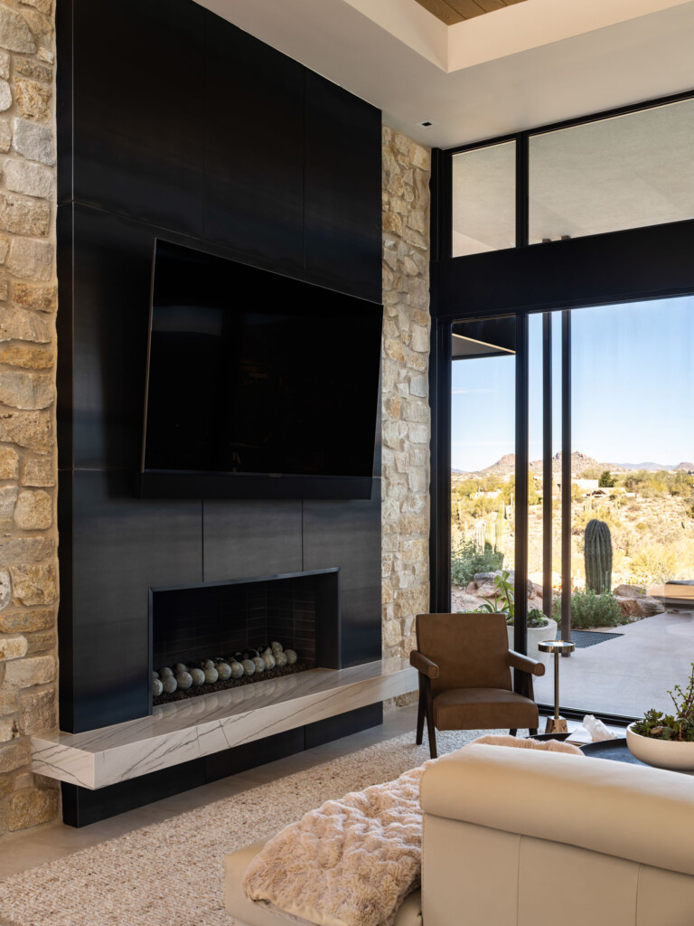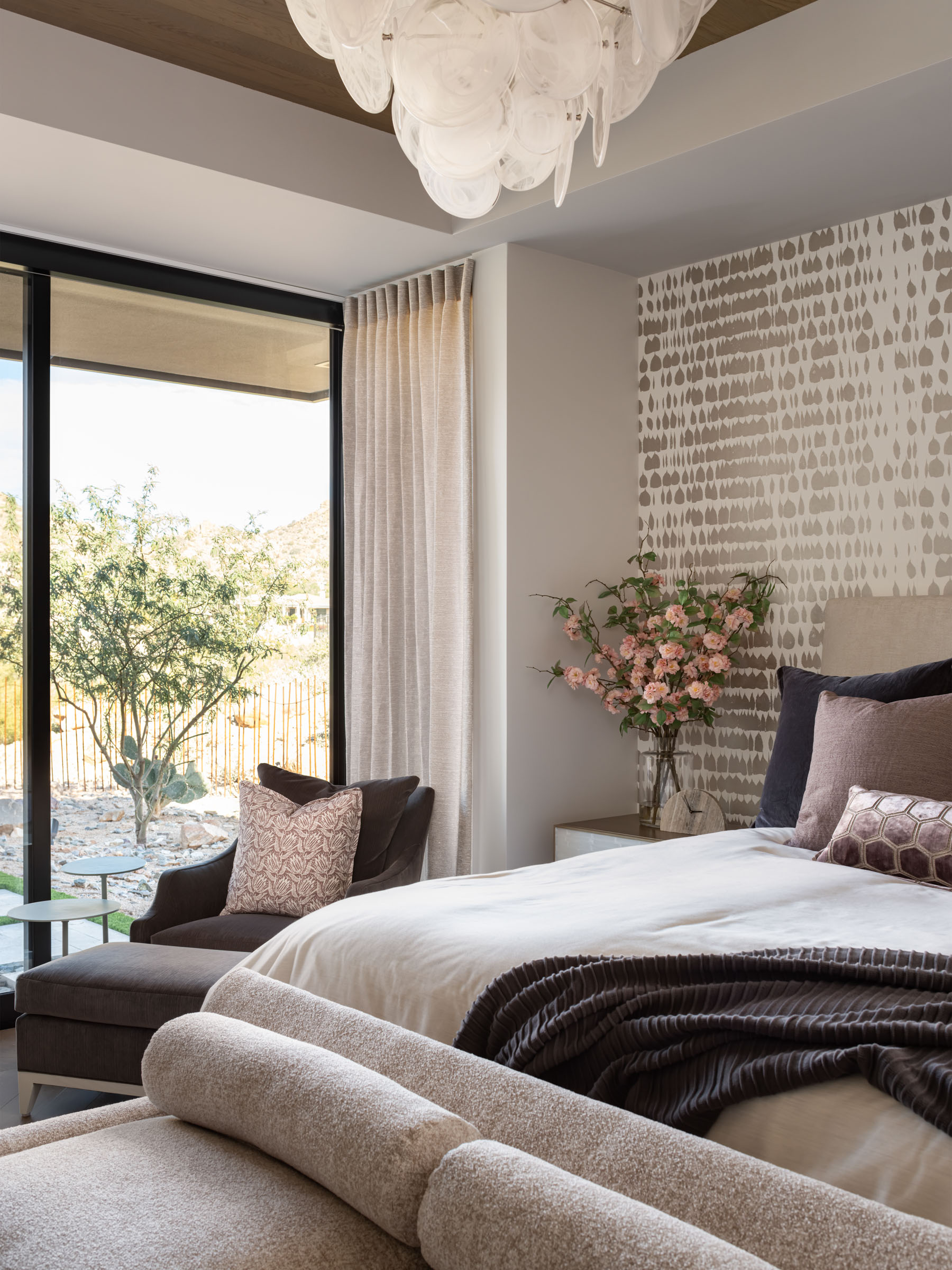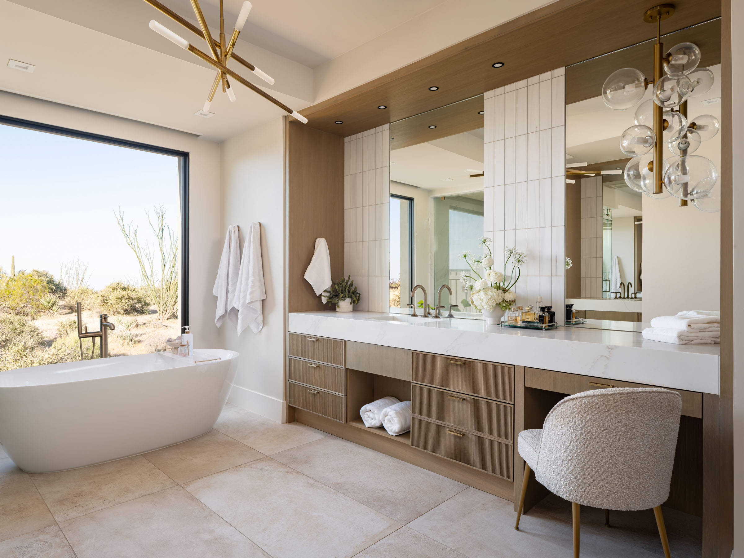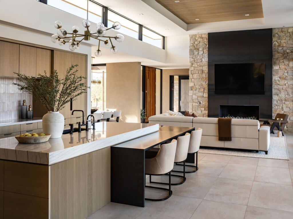 Perched within the Sonoran Desert, our Pinnacle Peak Estate new build project reflects the work of our luxury interior design firm in Scottsdale. Created with Modern Splendor Custom Homes and Clint Miller Architect, the home preserves the natural desert landscape while opening to sweeping mountain views. Contemporary architecture is softened by warm woods, stone, and a desert-inspired palette. Designed for empty nesters with space for visiting family, the home includes a custom casita as a mother’s suite—where clean modern lines meet a refined touch of glam, seamlessly layered into the overall design.