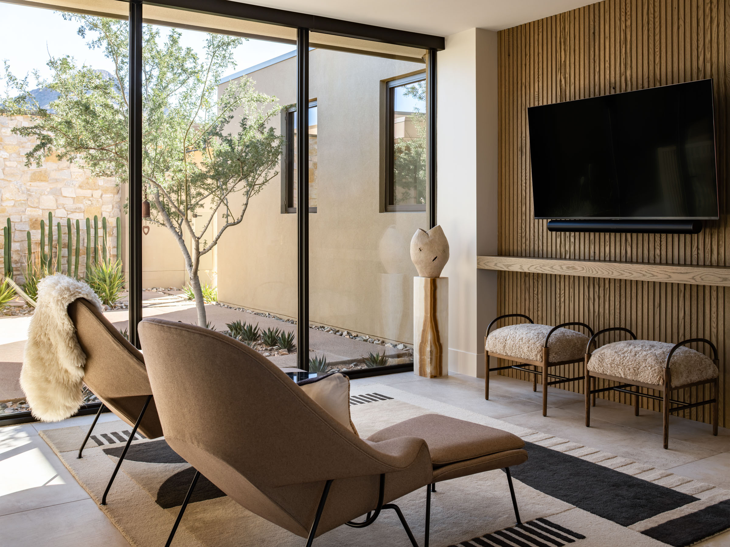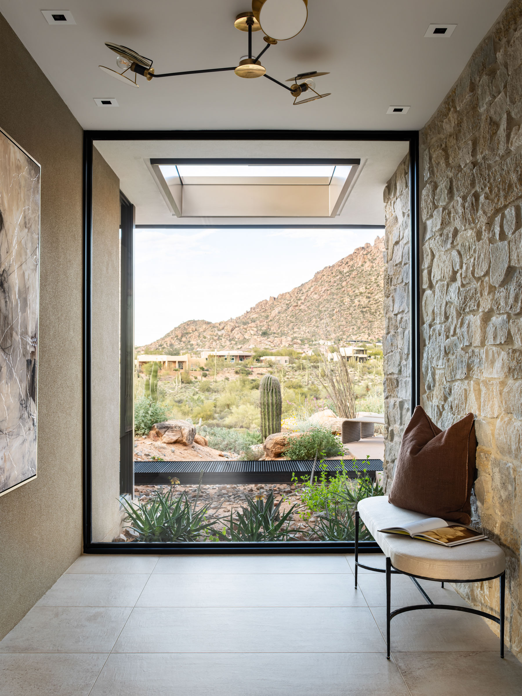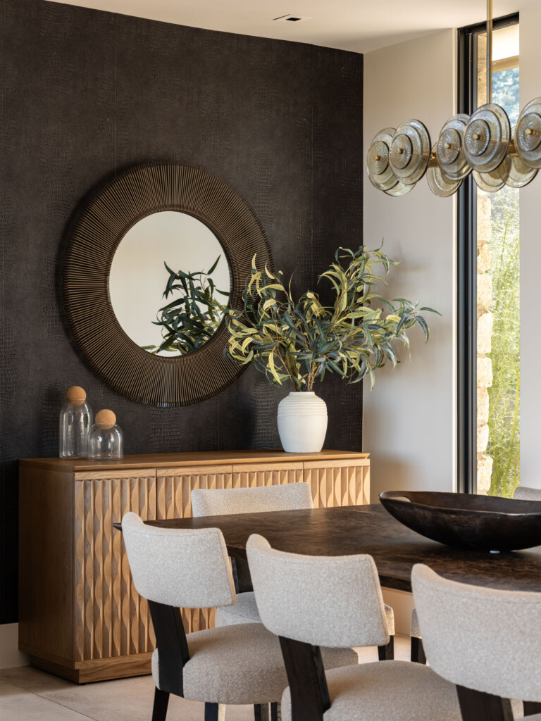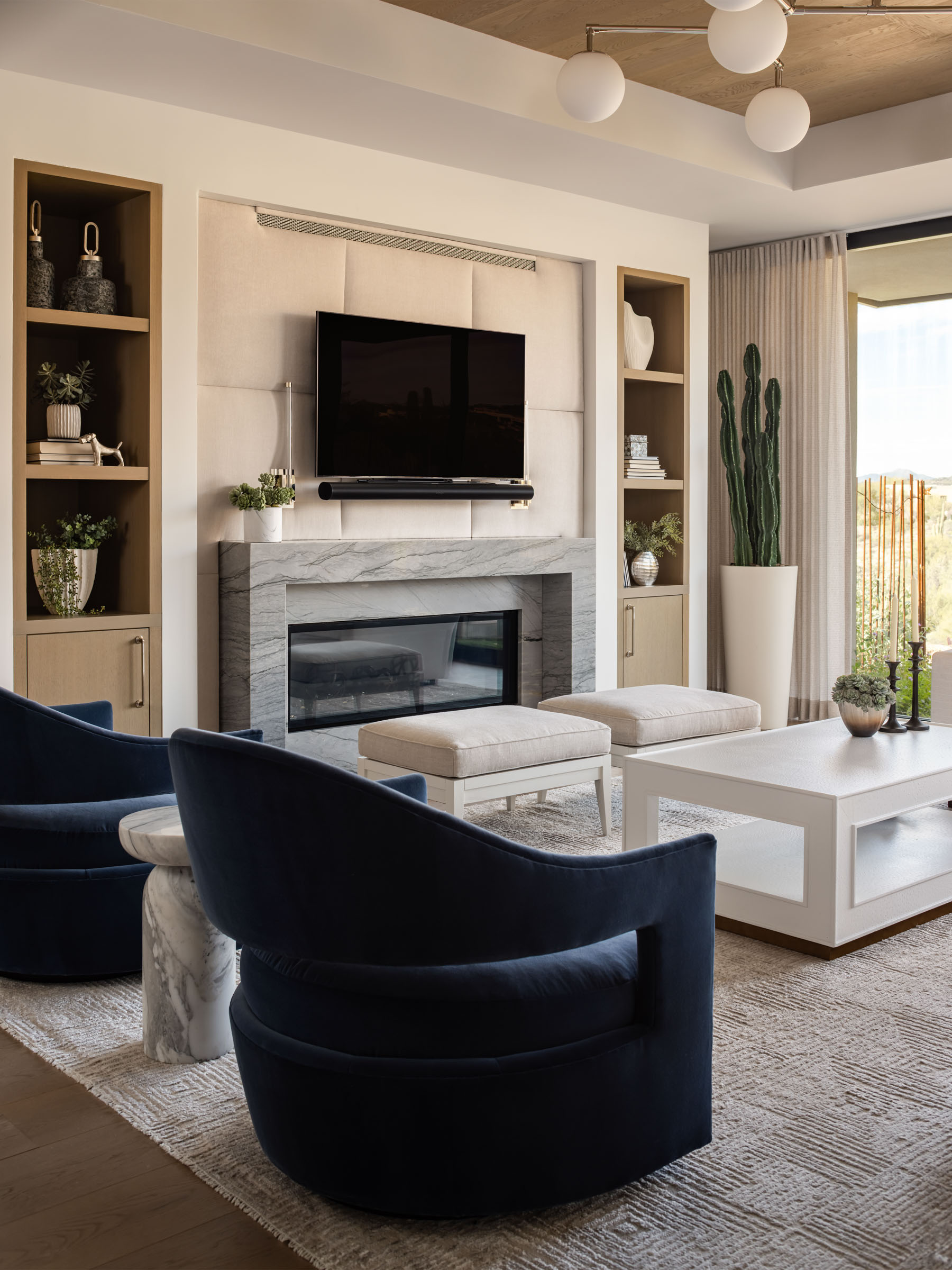 Perched within the Sonoran Desert, our Pinnacle Peak Estate new build project reflects the work of our luxury interior design firm in Scottsdale. Created with Modern Splendor Custom Homes and Clint Miller Architect, the home preserves the natural desert landscape while opening to sweeping mountain views. Contemporary architecture is softened by warm woods, stone, and a desert-inspired palette. Designed for empty nesters with space for visiting family, the home includes a custom casita as a mother’s suite—where clean modern lines meet a refined touch of glam, seamlessly layered into the overall design.
